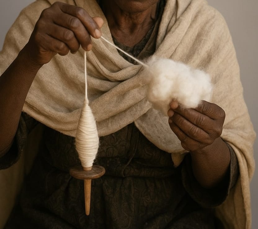 The raw cotton is hand-spun on drop spindles. This specialized skill, passed down from mother to daughter, creates a soft yet textured thread with intricate idiosyncrasies that make each resulting product a one-of-a-kind piece.